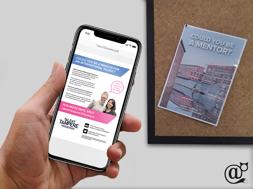 TalentTampereen projektia varten suunnittelin taiton sekä illustroin kuvakkeet Mentoring Pack 2017-2018 -lehtiseen, jonka tarkoituksena oli antaa apua ja tukea Suomen työmarkkinoiden saloista mentoroijille sekä mentoroitaville. Lehtistä jaetiin fyysisenä sekä nettiversiona yliopisto- ja ammattikorkeakouluopiskelijoille.