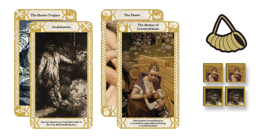 These 19 cards can be acquired throughout the game by performing the Golden Action. They depict various creatures and individuals found in Kalevala. The Character cards are considered upgrades from the Resource cards and thus their game effects are amplified.