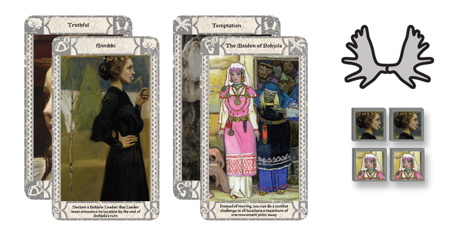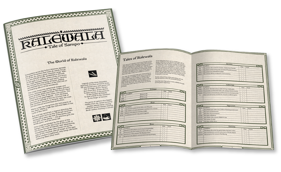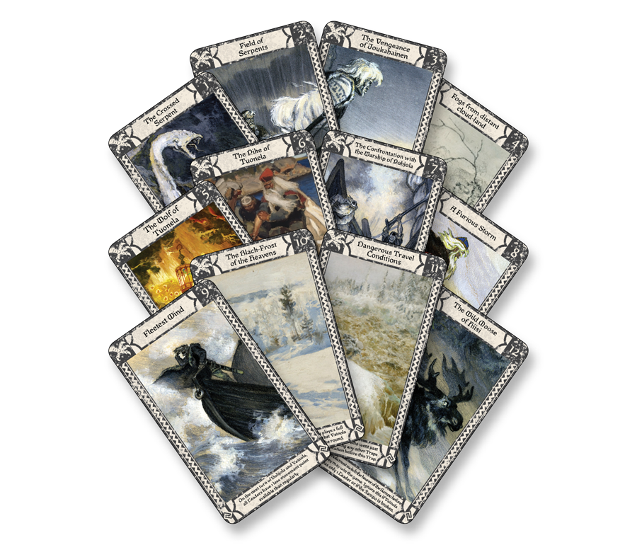 Julkaisemme upean immersiivisen lautapelin minkä tarina vie Kalevalan epookin myyttiseen aikaan. Satojen komponenttien pelissä on käytetty kuuluisten Kalevala-taiteilijoiden kuten Akseli Gallen-Kallela ja Nikolai Mikhaylovich Korchegin alkuperäisiä taideteoksia. Kantta koristaa Heikki Harmaisen upea karttaillustraatio, ja kokonaisuus on punottu yhteen graafisen suunnittelijan Annukka Revon avulla.